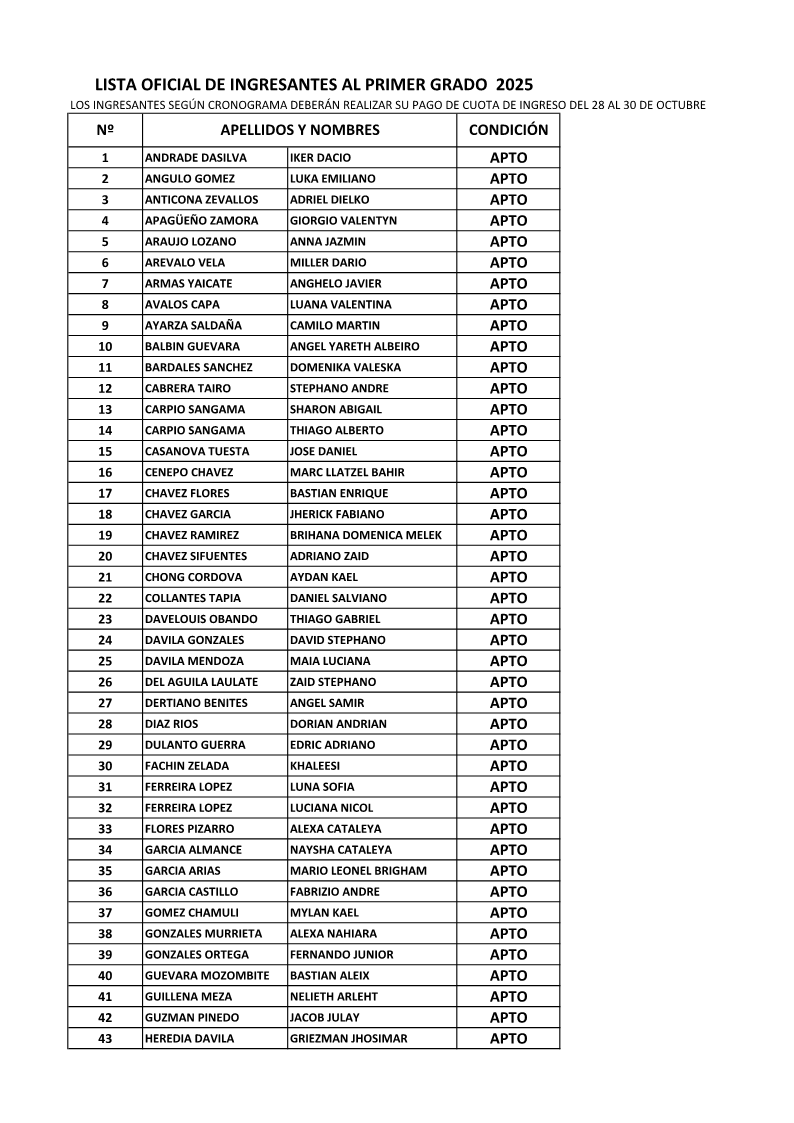 LISTA DE INGRESANTES AL PRIMER GRADO 2025